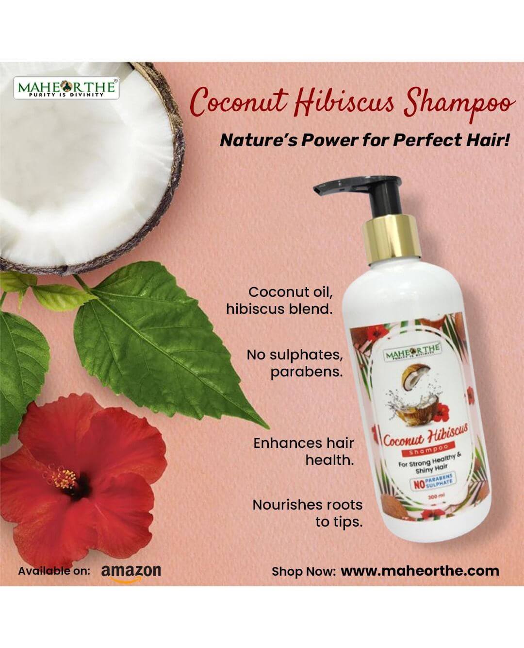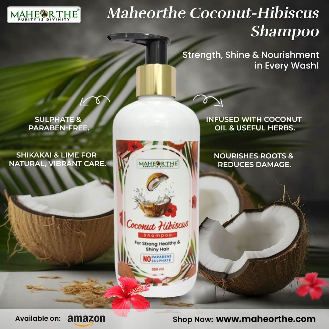 Maheorthe Coconut Hibiscus Shampoo brings together the richness of coconut oil and the floral strength of hibiscus in a gentle, sulphate-free formula. Designed to cleanse without stripping, this herbal blend supports scalp health, boosts volume, and softens hair with every wash. Infused with coconut and hibiscus goodness, mixed with aloe vera, amla, bhringraj, reetha and shikakai, it nourishes the roots, tackles dryness, and restores your hair’s natural shine. Mildly scented with natural attars and suitable for regular use, this 300 ml bottle is your go-to for a clean and balanced scalp. It allows the dirt-free follicles to strengthen with time and grow sturdier hair from the root to give you naturally beautiful and strong hair.